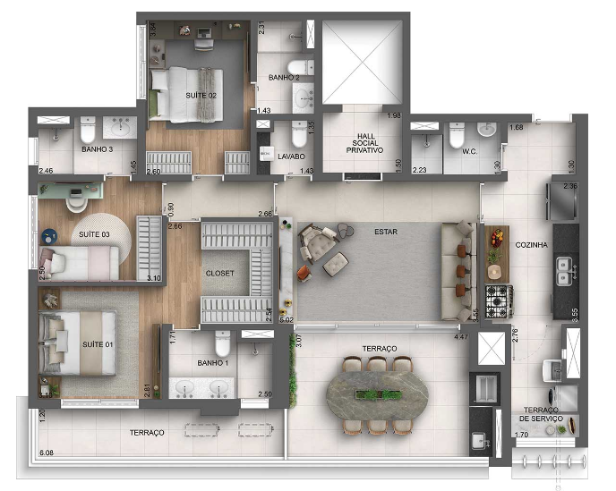 A arquitetura apresenta traços contemporâneos e proporções bem definidas, com fachadas que valorizam aberturas amplas, varandas generosas e maior entrada de luz natural. As unidades foram projetadas com plantas amplas e bem distribuídas, permitindo maior flexibilidade na organização dos ambientes e favorecendo a integração entre os espaços sociais, como living, sala de jantar e terraço. Essa configuração amplia a sensação de amplitude e reforça o caráter moderno do projeto residencial.