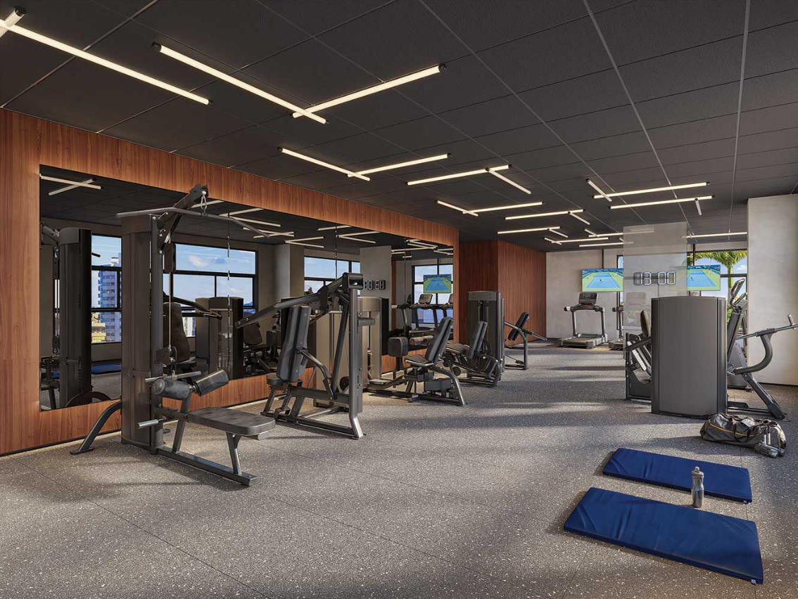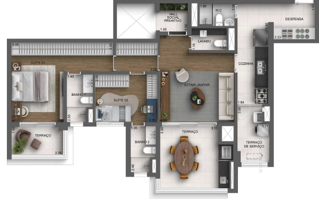 A arquitetura apresenta traços contemporâneos e proporções bem definidas, com fachadas que valorizam aberturas amplas, varandas generosas e maior entrada de luz natural. As unidades foram projetadas com plantas amplas e bem distribuídas, permitindo maior flexibilidade na organização dos ambientes e favorecendo a integração entre os espaços sociais, como living, sala de jantar e terraço. Essa configuração amplia a sensação de amplitude e reforça o caráter moderno do projeto residencial.