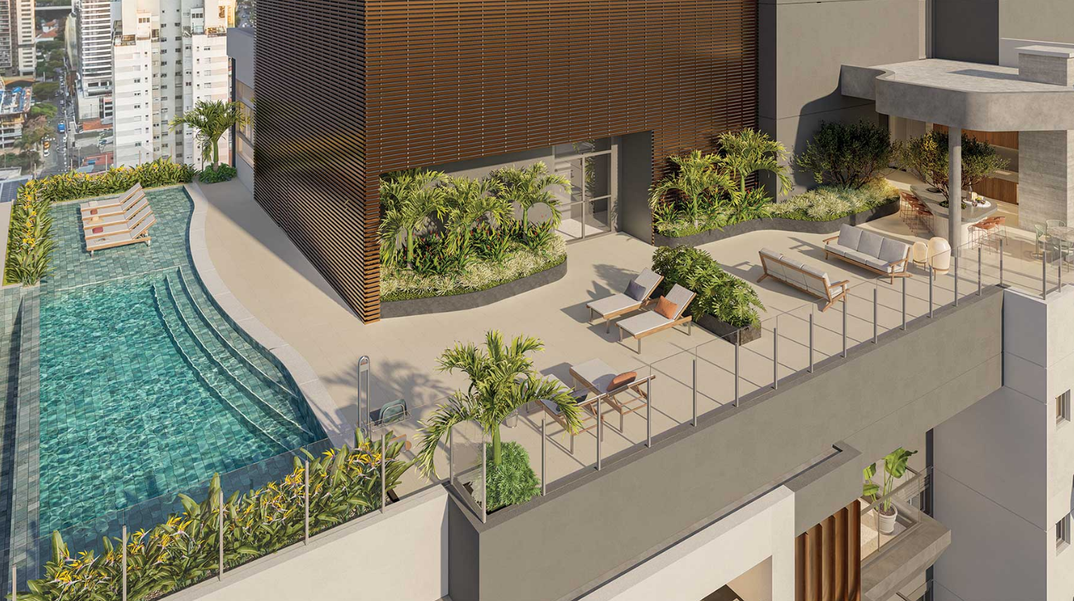 A proposta do empreendimento parte de um conceito residencial que busca equilibrar natureza, design e vida urbana. A implantação do condomínio prioriza a presença de áreas verdes e espaços de permanência integrados ao conjunto arquitetônico, criando ambientes agradáveis e acolhedores que contrastam com o ritmo intenso da cidade. Dessa forma, o projeto pretende oferecer um estilo de vida que alia conforto, privacidade e qualidade de vida.